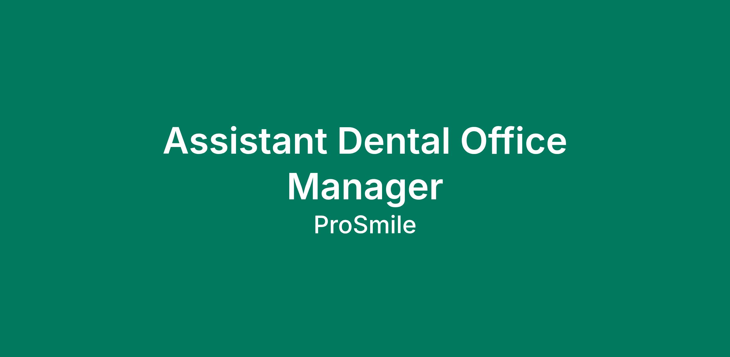 Position SummaryProSmile is in need of an Assistant Dental Office Manager who is looking to join a practice with a strong culture, compassionate and skilled dentists, and a support structure that creates an environment of learning and the autonomy to create change at the practice that brings about growth and success. We offer competitive pay based on experience with a great benefit package. As an Assistant Dental Office Manager, we give you the tools and support needed to ensure you are in the best position to be successful. A ProSmile Assistant Dental Office Manager is a unique opportunity to join a practice that is part of a larger growing organization and offers the ability to move up and take on higher positions within the company.