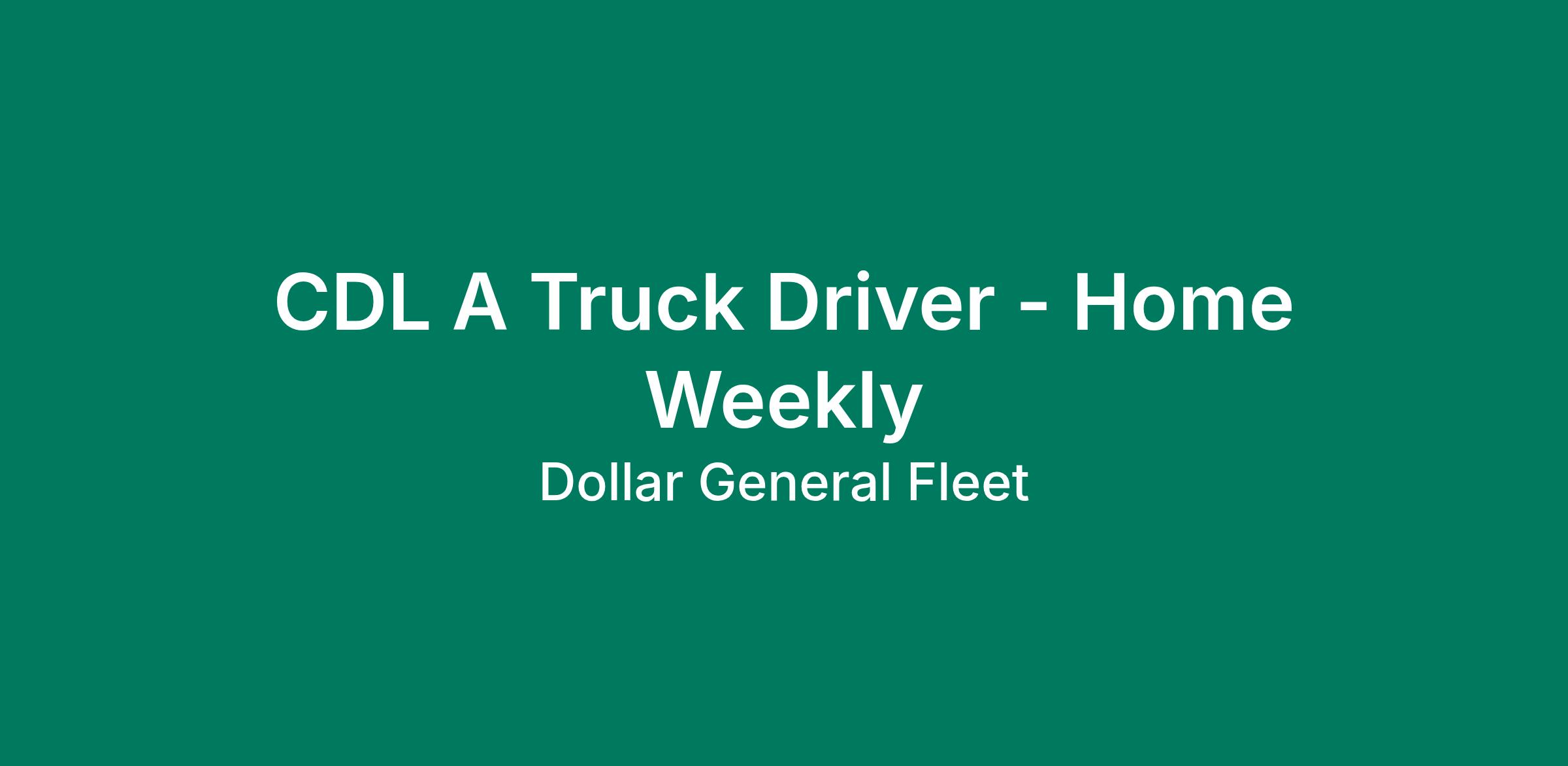 Dollar General is currently hiring Class A CDL Truck Drivers for regional home weekly routes. We take care of our DG family so that you can take care of yours. As a driver for Dollar General's private fleet, you will be connecting our distribution centers with existing Dollar General stores and new stores opening across the country. Apply today, or call us at (629) 290-1089 to speak with a recruiter. Key Offerings Earn up to $100,000 per year* Quarterly Safety Bonuses Unlimited referral bonuses (Up to $2,500 per referral) Competitive benefits and 401k available Day 1 Weekly home-time Zero Cost Rider Policy Pet policy- We love our furry family too! Mile and Stop pay New equipment Paid weekly *Pay varies by route, location, experience level and bonus eligibility. CDL-A Truck Driver Requirements: Valid Class A CDL Must be 21 years of age 1year previous tractor/trailer driving experience