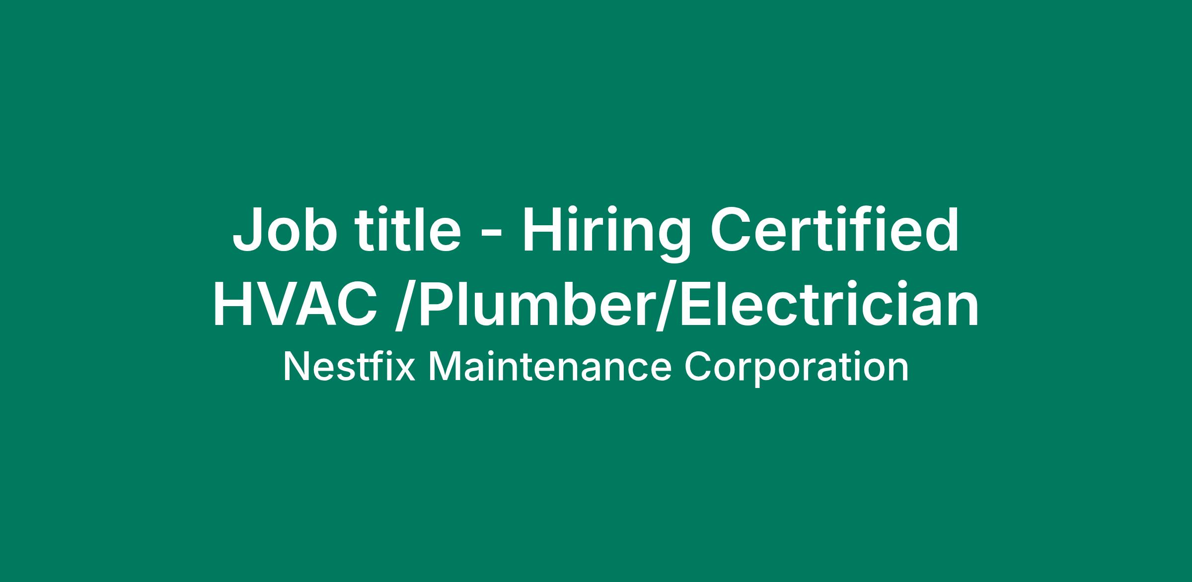 NestFix Maintenance Corp. is looking for certified Handyman , HVAC /Plumber/Electrical technicians to join our team. The HVAC /Plumber/Electrician will be based out of our NewYork office and is responsible for providing on-site client installation, repairs, and maintenance of the issues.