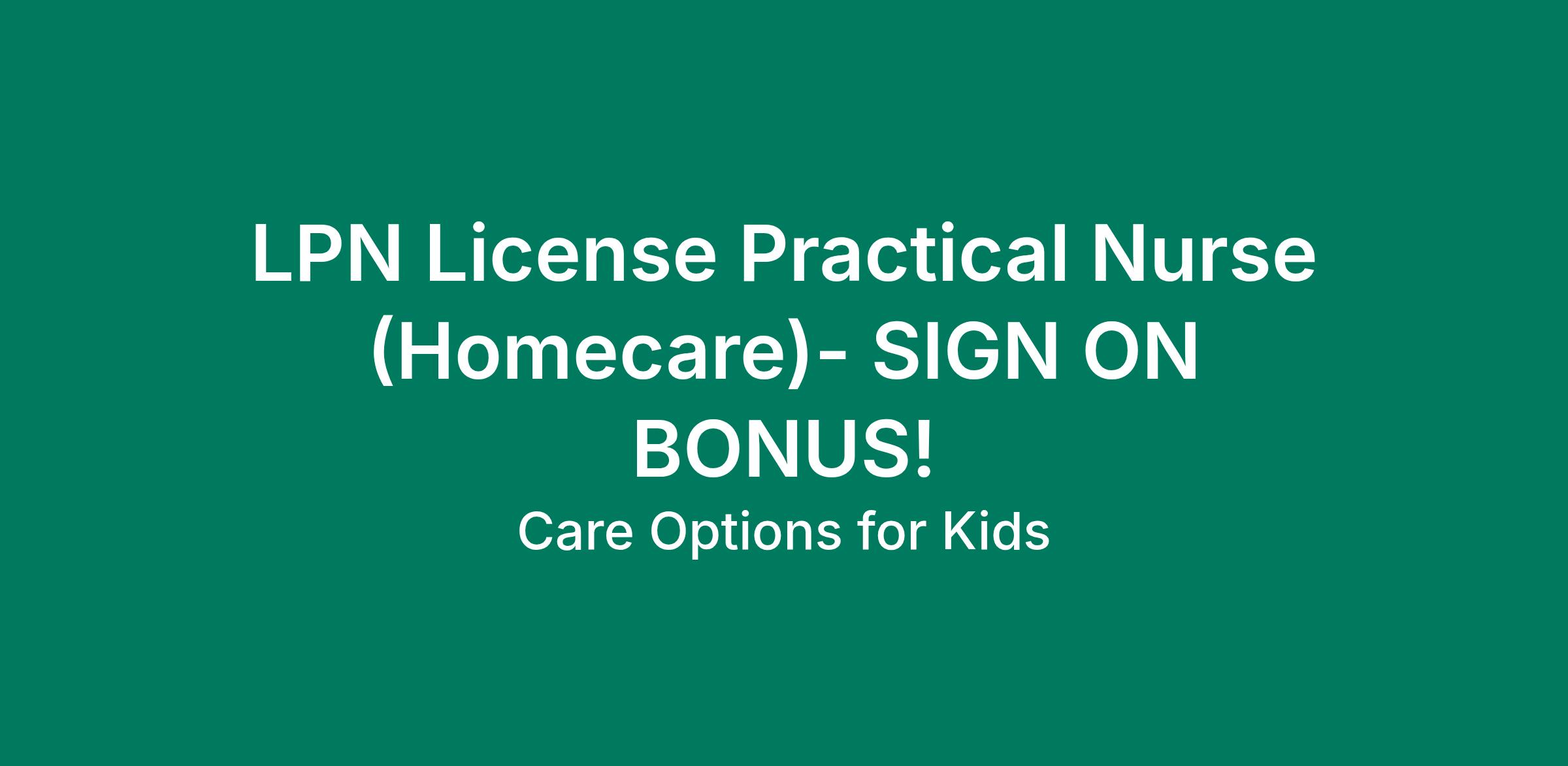 About the Role At Care Options for Kids, we provide 1:1 care in the home, and we do things a little differently. There's no revolving door of patients or hospital setting chaos blinking call lights, scurrying doctors, and wards bursting at the seams. Instead, you work with self-sufficient autonomy, empowered to make a real difference in your clients' lives. We value your clinical knowledge and respect the deep one-on-one bond you establish with the families you care for. Of course, if you need anything, your Director of Nursing is only a phone call away we offer 24-hour, 365-day support and on-demand clinical resources. Benefits for Licensed Practical Nurses (LPNs) $500 bonus for qualified LPN's* Paid Time Off (PTO) and flexible schedule Medical, Dental and Vision Coverage 401k Weekly pay and direct deposit 24/7 On Call for support Career advancement Nurse Referral bonus Training opportunities Respiratory therapists on staff to provide training and mentorship Responsibilities of Licensed Practical Nurses (LPNs) Providing one-to-one nursing care in a home environment Taking direction from clinical team and being overseen by a registered nurse Following the plan of care Following all clinical and office policies Requirements for Licensed Practical Nurses (LPNs) Valid New Jersey LPN License or Multistate License Physical from within three years TB Skin Test (PPD)or TB Blood Test (QF) Valid BLS CPR card (obtained in person not online) Valid driver's license G-tube, trach, vent experience or willing to train About Care Options for Kids Care Options for Kids is the leading provider of pediatric nursing services. Our mission is to provide high-quality pediatric services that help children and families live their best lives. Achieving that mission can only be accomplished with talented and caring nurses like you. With locations in Colorado, Texas, Arizona, Nevada, Florida, Oregon, Washington, California, Wyoming, New Jersey, Delaware, and Pennsylvania, the Care Options for Kids Community offers a wide range of pediatric health services, including pediatric nursing and therapies, ABA therapy, nursing, Family Caregiver Services, and school-based services. We value the health and well-being of our nurses and understand the vital role you play in caring for our clients. PPE is provided in each home including masks, gloves, and hand sanitizer. We follow CDC guidelines to ensure you, your client, and your family stays healthy. *Bonus for eligible cases only. The eligible employee will receive $500 after 500 billable hours worked. Eligible employees must complete the pre-onboarding process within 10 days of submission of the initial application. Valid for first-time employees only and on completion of all required documents. Parents and/or Guardians of a current or potential Preferred Home Health Care, a Care Options for Kids client are not eligible to receive a bonus. Not to be combined with any other Preferred Home Health Care or Care Options for Kids offers. Talk with your dedicated recruiter for more information. #APPNUSO #RDNUSO Salary: $72800.00 - $74880.00 / year