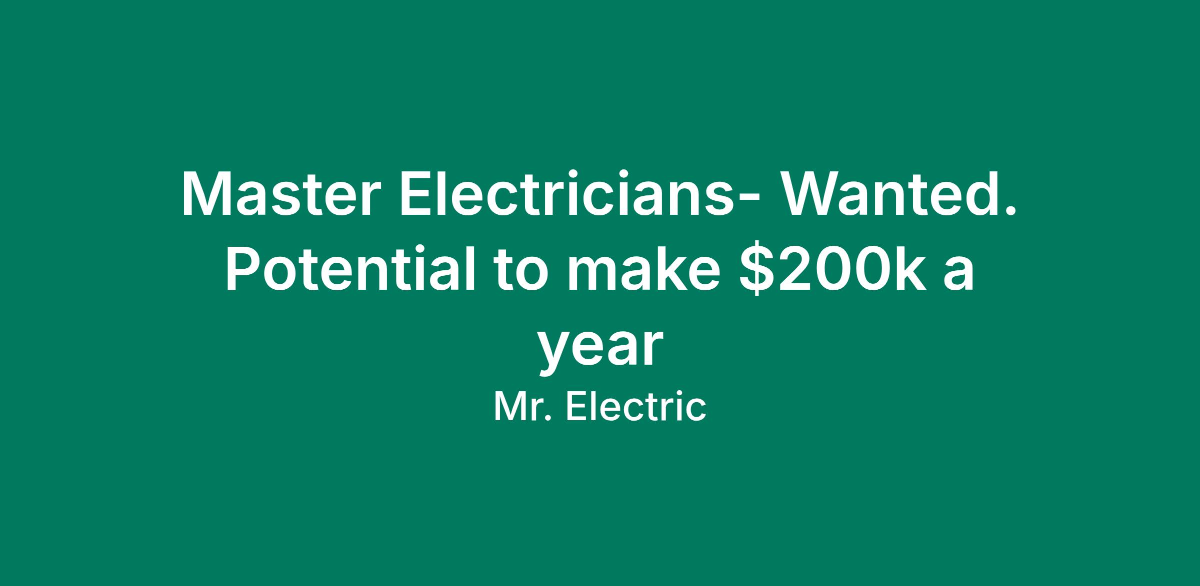 Mr. Electric LLC is the franchisor of the Mr. Electric® franchised system. Each Mr. Electric® franchised location is independently-owned and operated by an independent franchisee performing services. As a service to its independent franchisees, Mr. Electric LLC lists employment opportunities available throughout the franchised network so those employment opportunities may be conveniently found by interested parties at one central location for brand management purposes only. Mr. Electric LLC is NOT the employer seeking help. The only employer is the independent franchisee who has listed its available positions on this website.