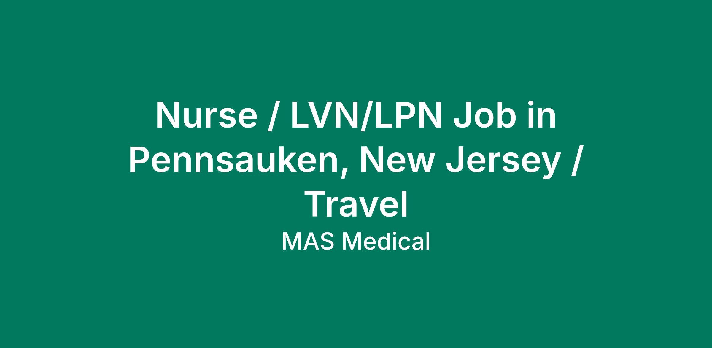 Licensed Practical Nurse(LPN) / TravelLicensed Practical Nurse - Travel - NJAt MAS Medical Staffing, our employees enjoy industry leading compensation packages and benefits, including:Competive weekly payGenerous housing stipends and housing assistance 401K ask for more details Health & Life Insurance coverage Travel reimbursement Licensure assistance & reimbursement Referral Bonus Program MAS Rewards Me Bonus Program Recruiters on call 24/7 via text, email, or phone. If you are looking for a staffing agency that has your best interest at heart and a recruiter that will work 1 on 1 with you to find the best assignment available, please reach out to us today!