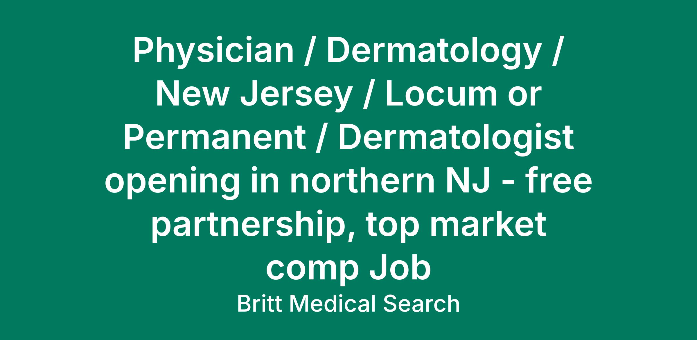 Dermatology practice in northern NJ is seeking BE/BC Dermatologist to join their team. Group offers above market rates and big signing bonuses.