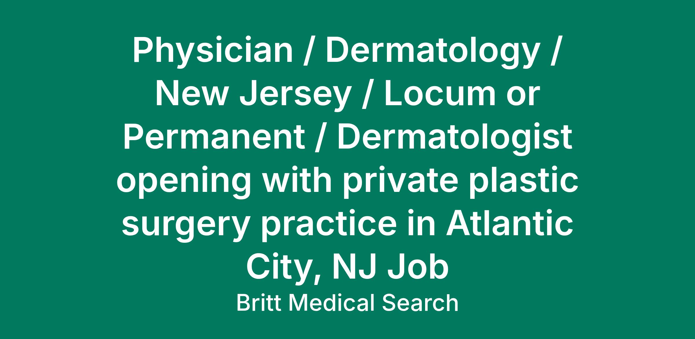 Highly successful and established private plastic surgery practice is seeking to expand its service line and add a BE/BC Dermatologist to its team in Atlantic City, NJ. Practice serves Atlantic City, Atlantic County, Cape May County, and other south New Jersey and Philadelphia residents.