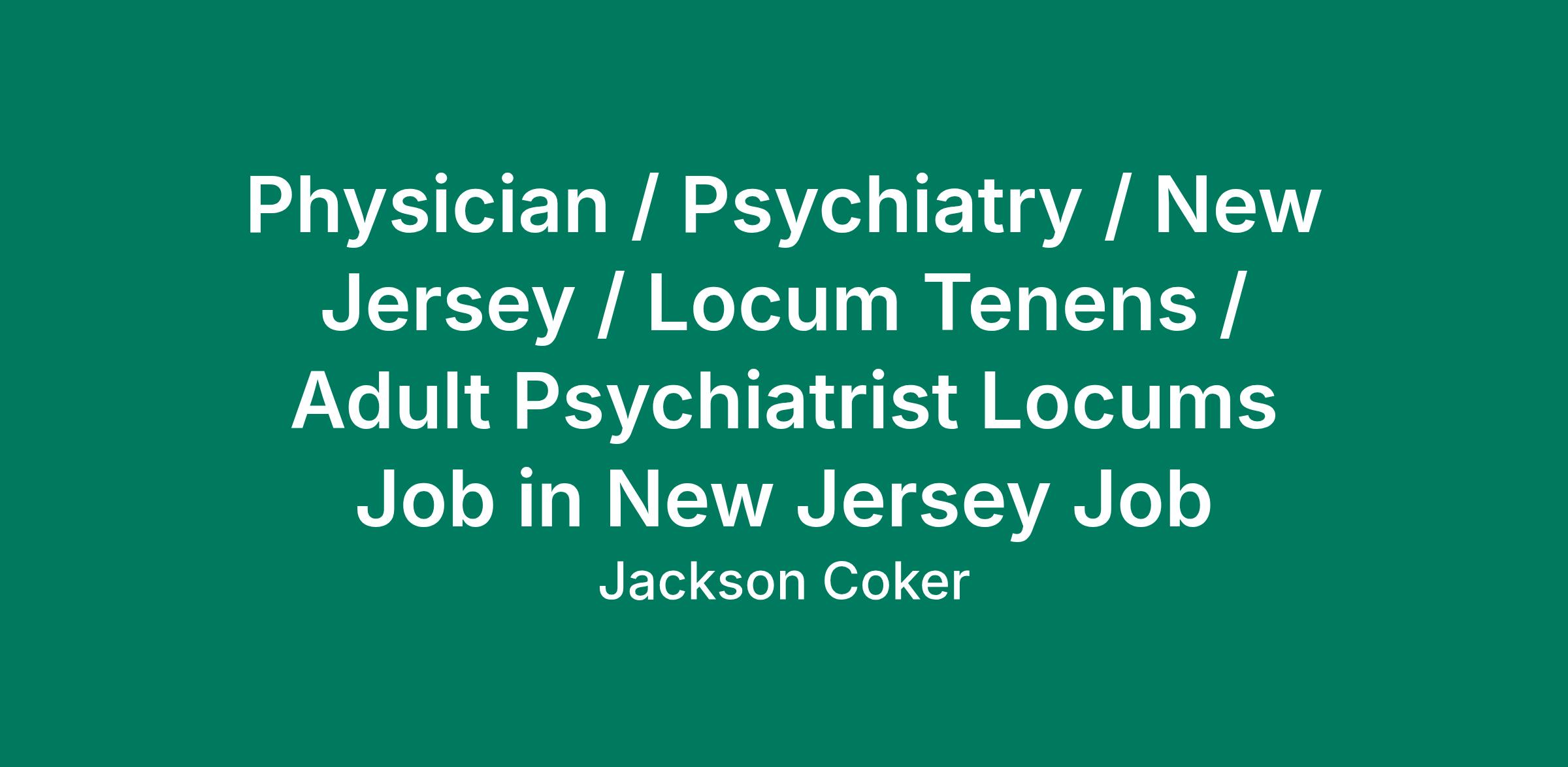 Adult Psychiatrist Locums Job in New Jersey Details/Requirements: Monday to Friday Adult patients Some call Support staff Inpatient New Jersey license EMR in place Jackson and Coker offers: + Weekly Direct Deposit + Top Rated Malpractice Insurance + In-House Travel Agency + 24/7 Recruiter Availability + Experienced In-House Privileging Coordinators
